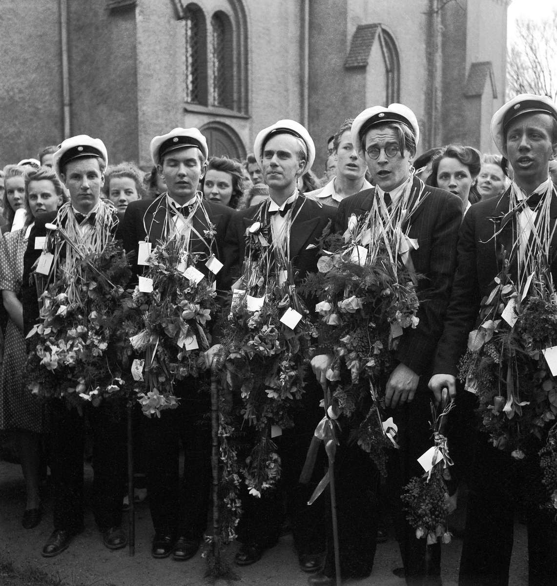 En grupp studenter vid Tegnérstatyn. Man verkar sjunga något.