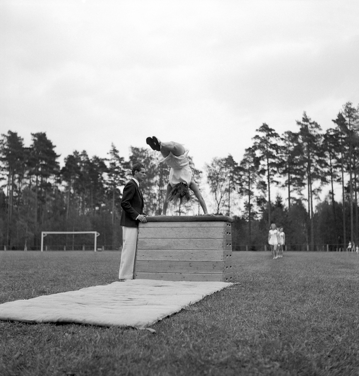 Gymnastikuppvisning på plint av några kvinnliga gymnaster.