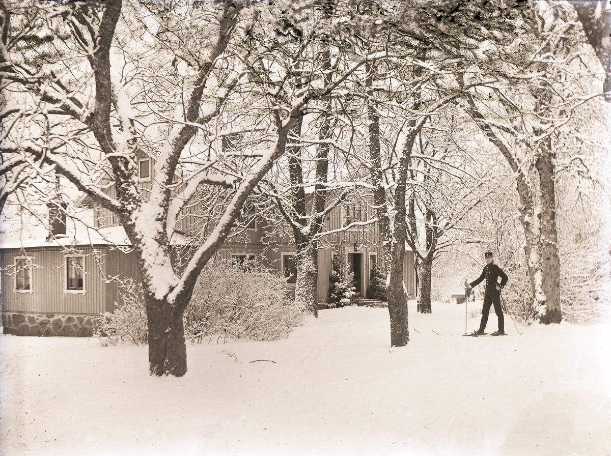 En skidlöpare har stannat till i en snöig trädgård. Till vänster skymtar ett ljust, brädpanelat bostadshus.