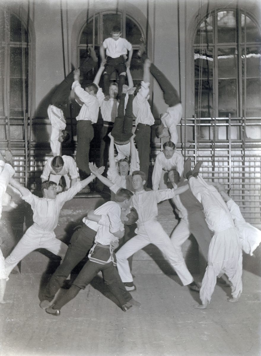 Några gymnaster som övar i en gymnastiksal, möjligen på läroverket i Växjö.