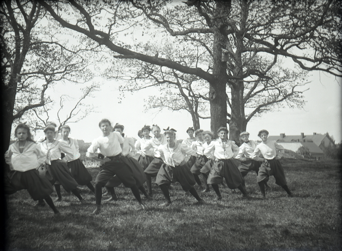 Några kvinnliga gymnaster i blus och s.k. ballongbyxor, som gymnastiserar utomhus. I bakgrunden skymtar några hus.