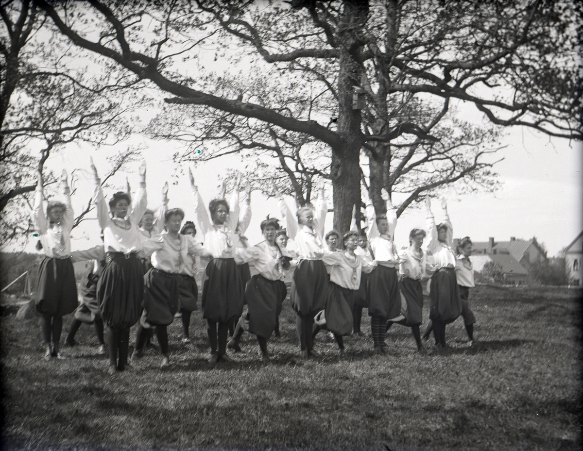 Några kvinnliga gymnaster i blus och s.k. ballongbyxor, som gymnastiserar utomhus. I bakgrunden skymtar några hus.
