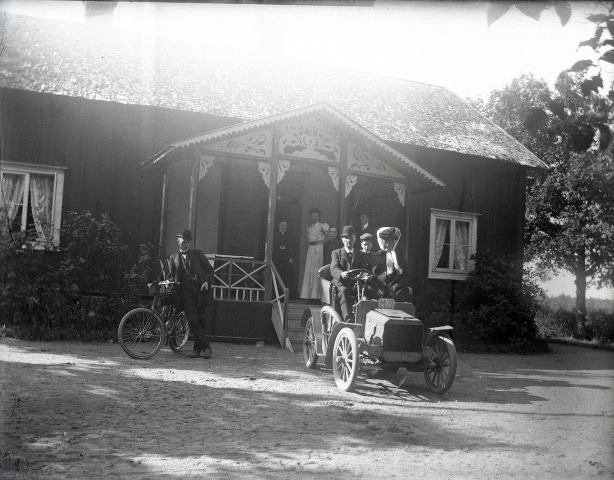 En bil med registreringsnummer M 79 är parkerad framför ett bostadshus på landet, troligen i närheten av Urshult.