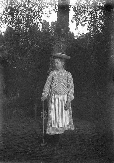 En flicka i rutig klänning, förkläde och stråhatt, som håller en krocketklubba i handen.