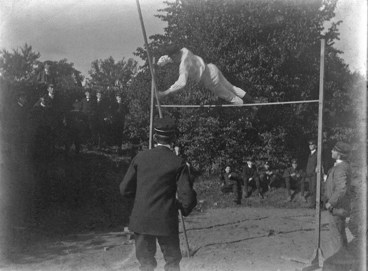 En ung man som hoppar stavhopp, påhejad av åskådare i kavaj och skolmössa.