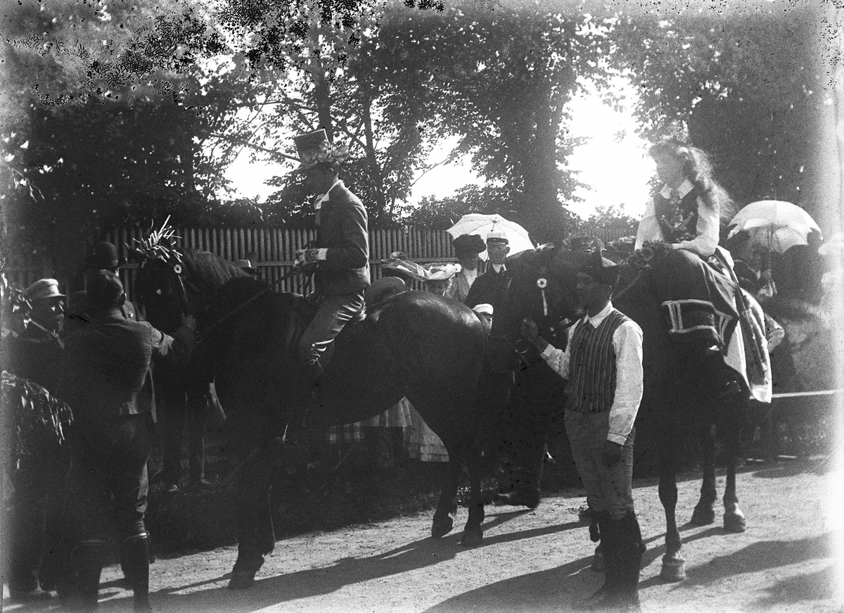 Några utklädda ryttare (varav en kvinna i Värendsdräkt) .
