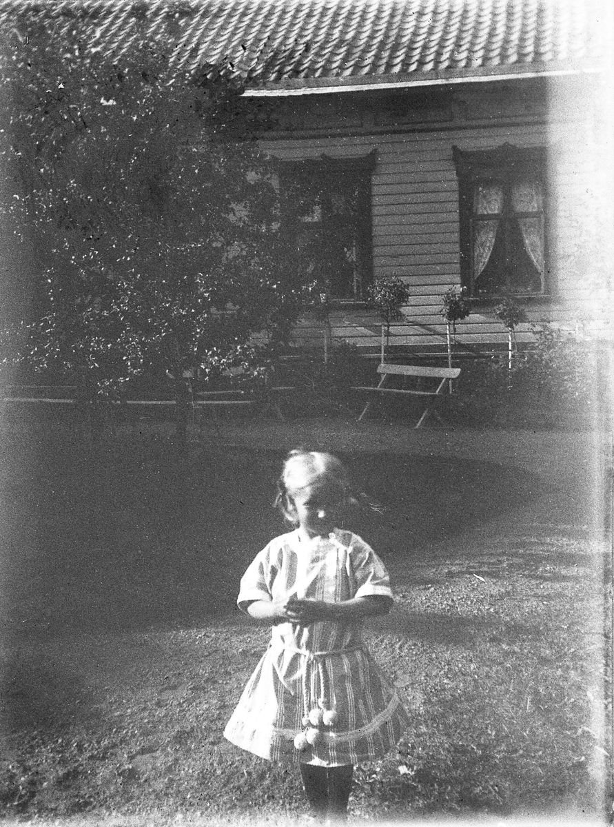 En liten flicka i en trädgård. I bakgrunden ser man ett träpanelat bostadshus.