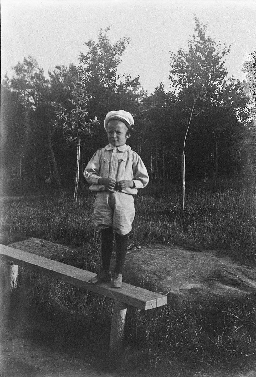 En pojke i knäbyxor m.m. På huvudet har han en rund, vit mössa. Han står på en trädgårdsbänk.