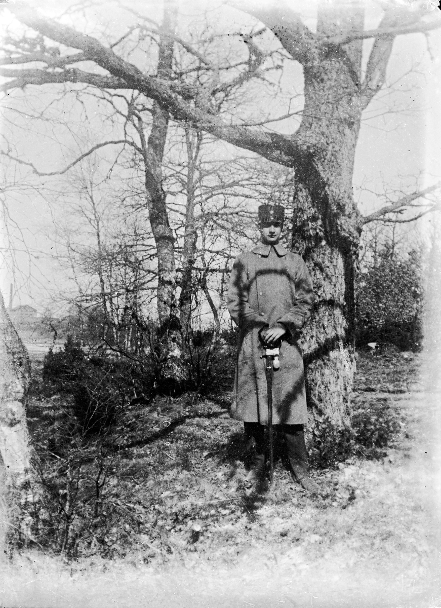En ung man i militärkappa m.m., en vårdag. Han står vid en stor ek. I bakgrunden till vänster kan man skymta ett sågverk eller likn.