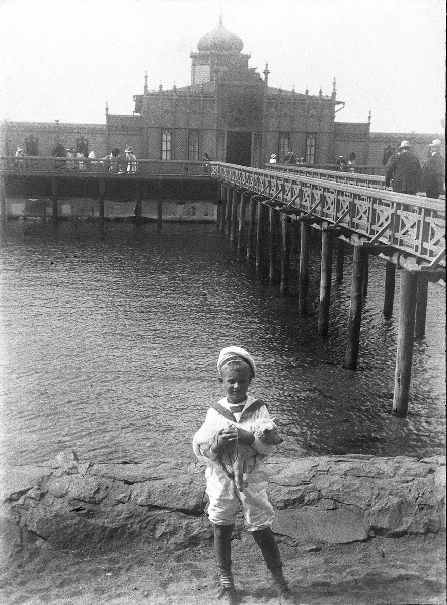 En pojke i sjömanskostym, som håller en hundvalp i famnen.