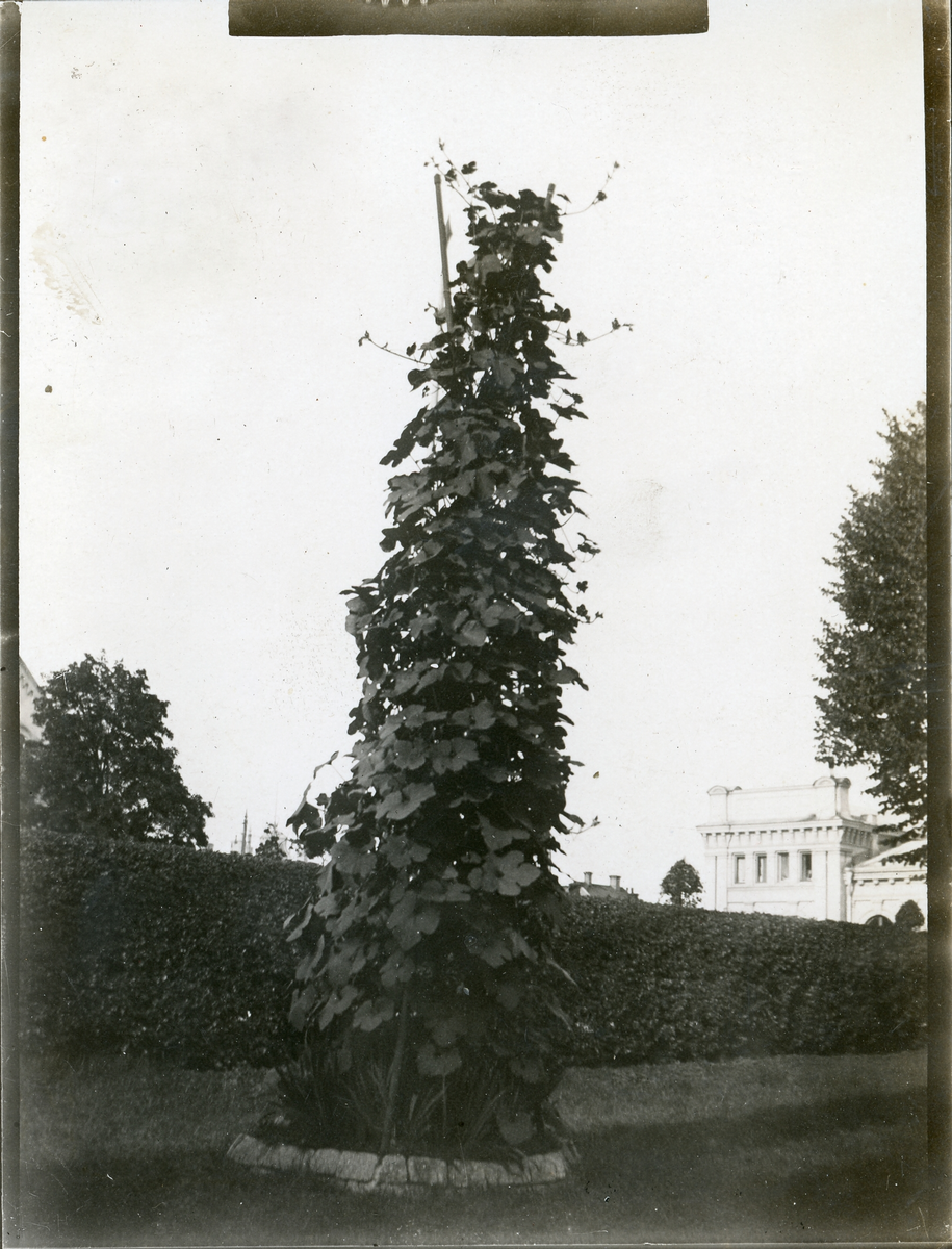 Foto av en hög växt framför en häck med en byggnad i bakgrunden.