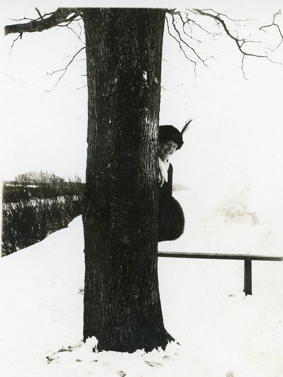 Foto av Anna-Lisa som står bakom ett träd (enligt text skriven i albumet).