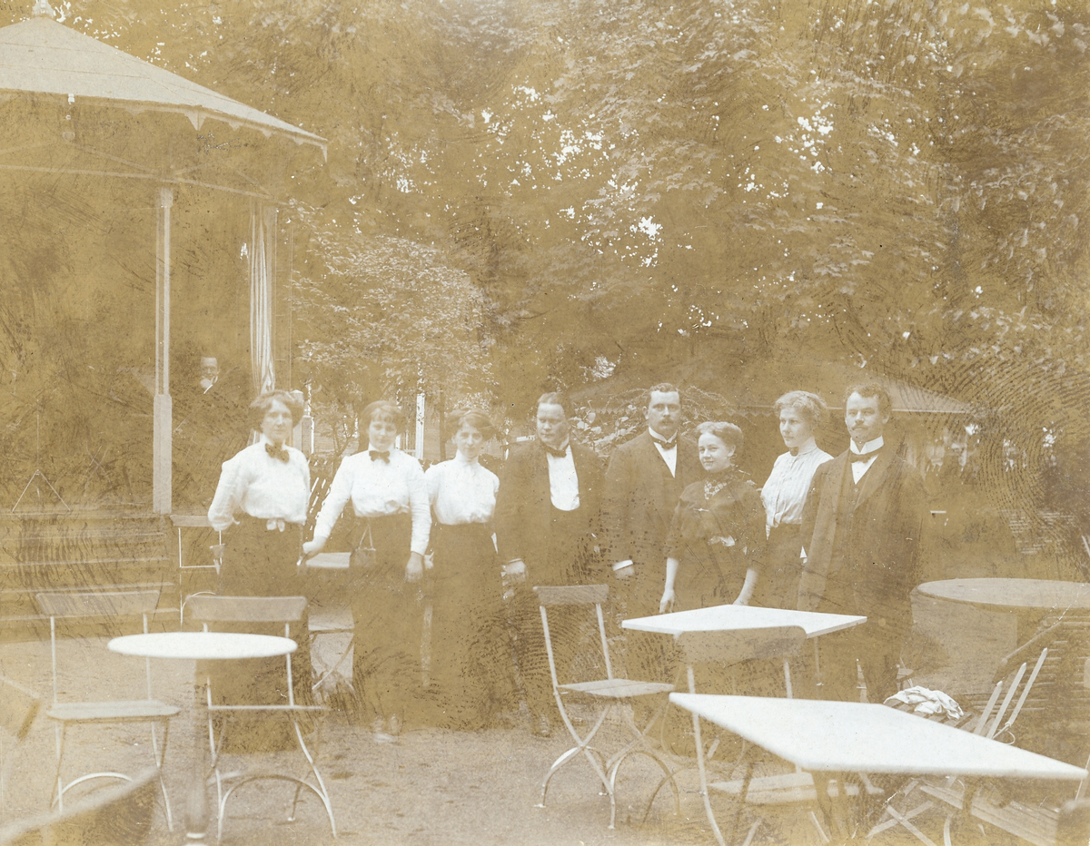 Foto av gården till Stadshotellet i Hudiksvall som Olle förestod en sommar åt källarmästare Dal, 1912, med personal (enligt text skriven i albumet).