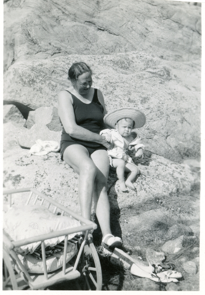 Foto av mamma Tora med skådespelare Åke Söderbloms pojk, från smögen 1947 (enligt text skriven i albumet).