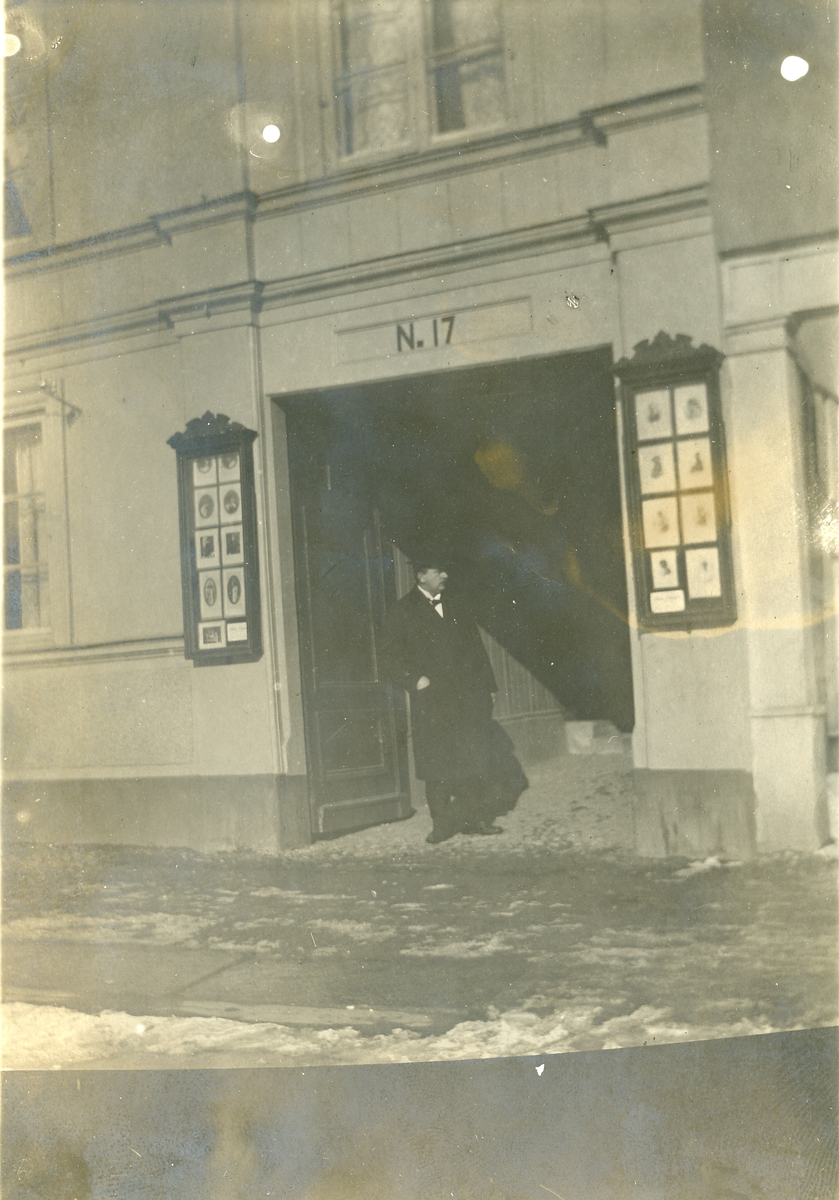 Foto av pappa som står i porten till vårt första hem i Uppsala (enligt text skriven i albumet).