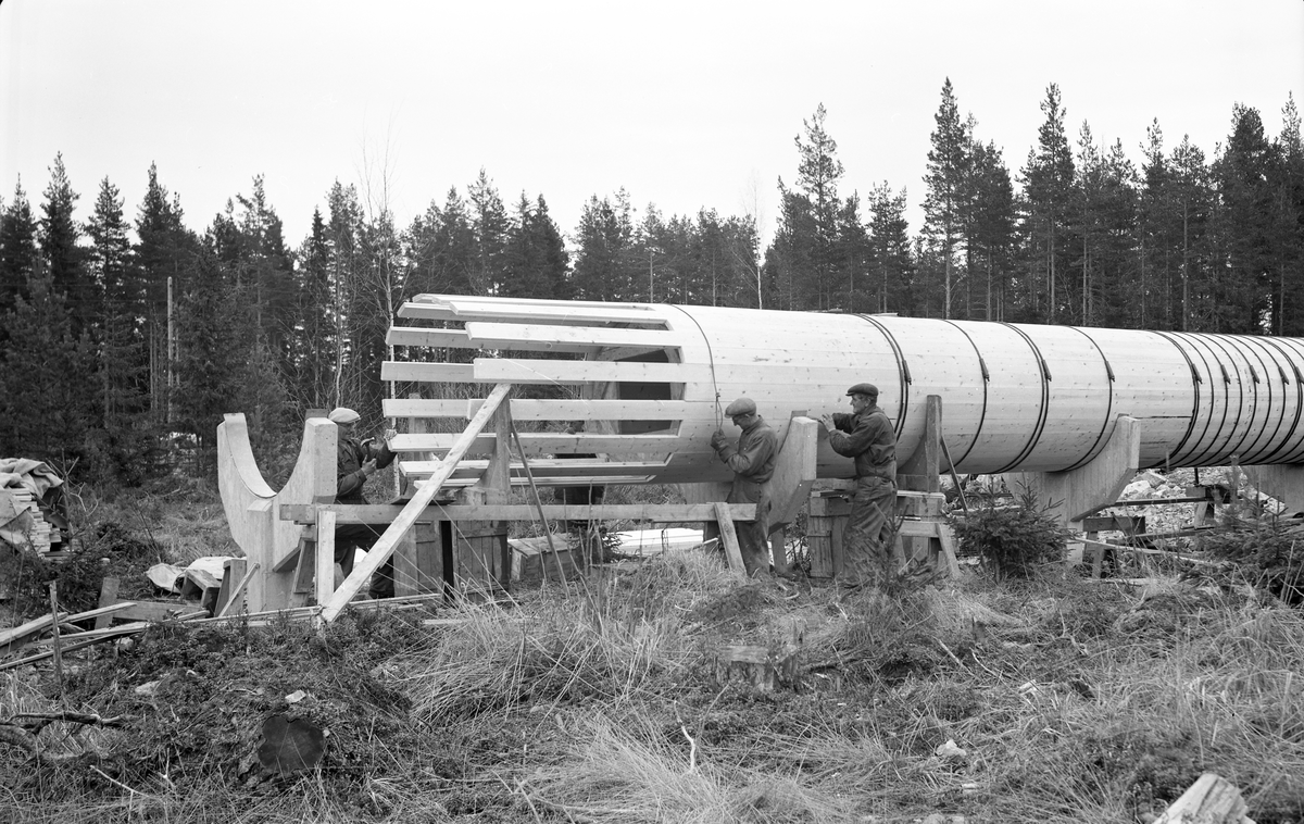Titel: En vattentub för sötvattenförsörjning byggdes omkring 1950 av Korsnäs AB. Tuben leder än idag vatten från det gamla fiskeläget Kullen i Bodaån i Skutskär via sjön Trösken till Korsnäsfabriken, där det renas. Vattentuben har en invändig diameter på 1,4 meter och en kapacitet av cirka 200.000 liter i minuten.