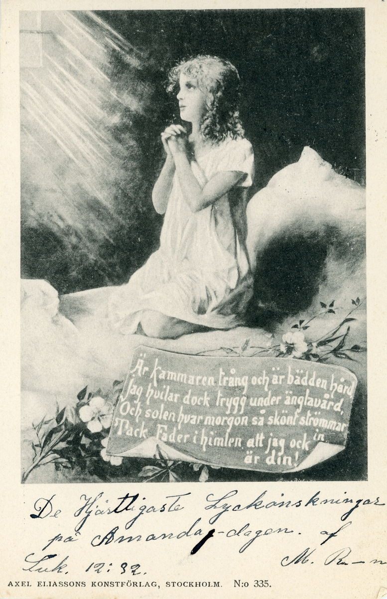 Motiv av en flicka som ber i sin säng. Axel Eliassons Konstförlag, Stockholm. Text på framsidan: " De Hjärtligaste Lyckönskningar på Amanda-dagen af M. R.._n? Luk. 12:32". Tryckt text:
