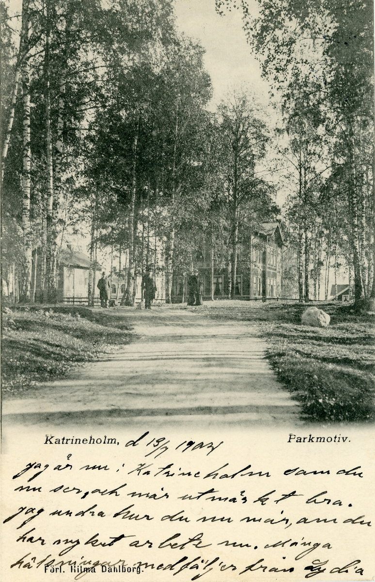 Brevkort adresserat till sjuksköterskan Amanda Palm. Parkmotiv från Katrineholm med människor på promenad. Förl. Hilma Dahlborg.
