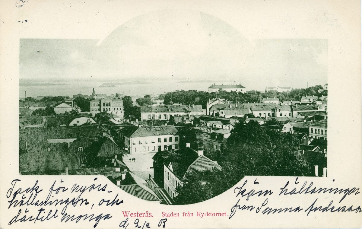Brevkort adresserat till sjuksköterskan Amanda Palm, 1903. Motivet är vy över staden Västerås, fotot taget från kyrktornet.
