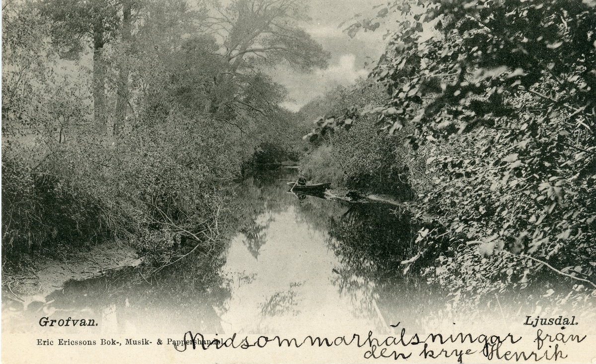 Brevkort adresserat till sjuksköterskan Amanda Palm, 1903. Motiv från Grofvan i Ljusdal. Eric Ericssons Bok-, Musik- & Pappershandel.