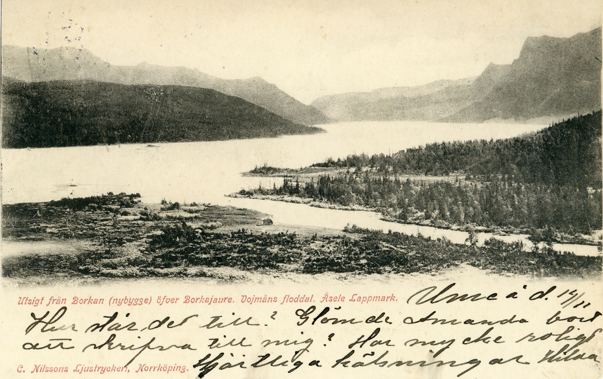 Motiv med utsigt från Borkan (nybygge) öfver Borkajaure. Vojmåns floddal, Åsele Lappmark.