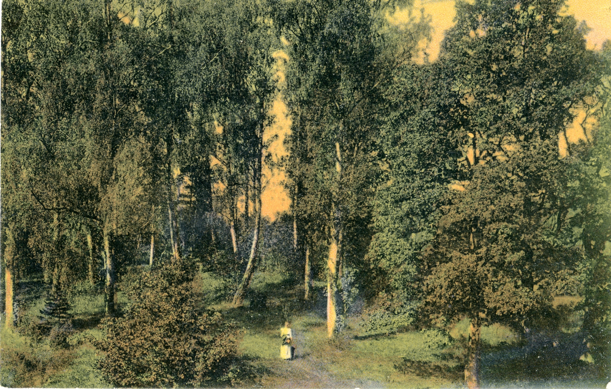 Motiv av parti från Skurusund med en kvinna på en skogsväg.