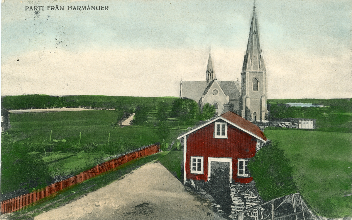 Motiv av parti från Harmånger med kyrka i bakgrunden och ett hus längst fram.