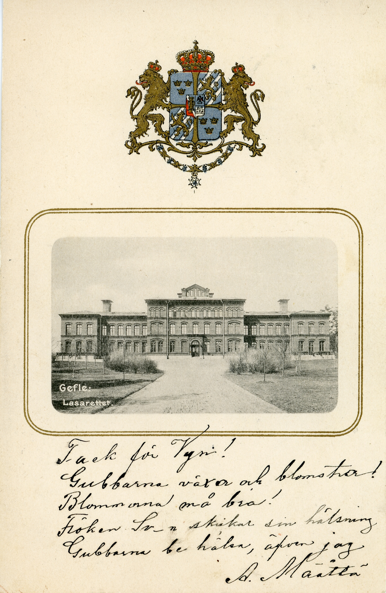 Brevkort adresserat till sjuksköterskan Amanda Palm. Motiv av Gefle Lasarett och ett emblem med Sveriges Riksvapen.