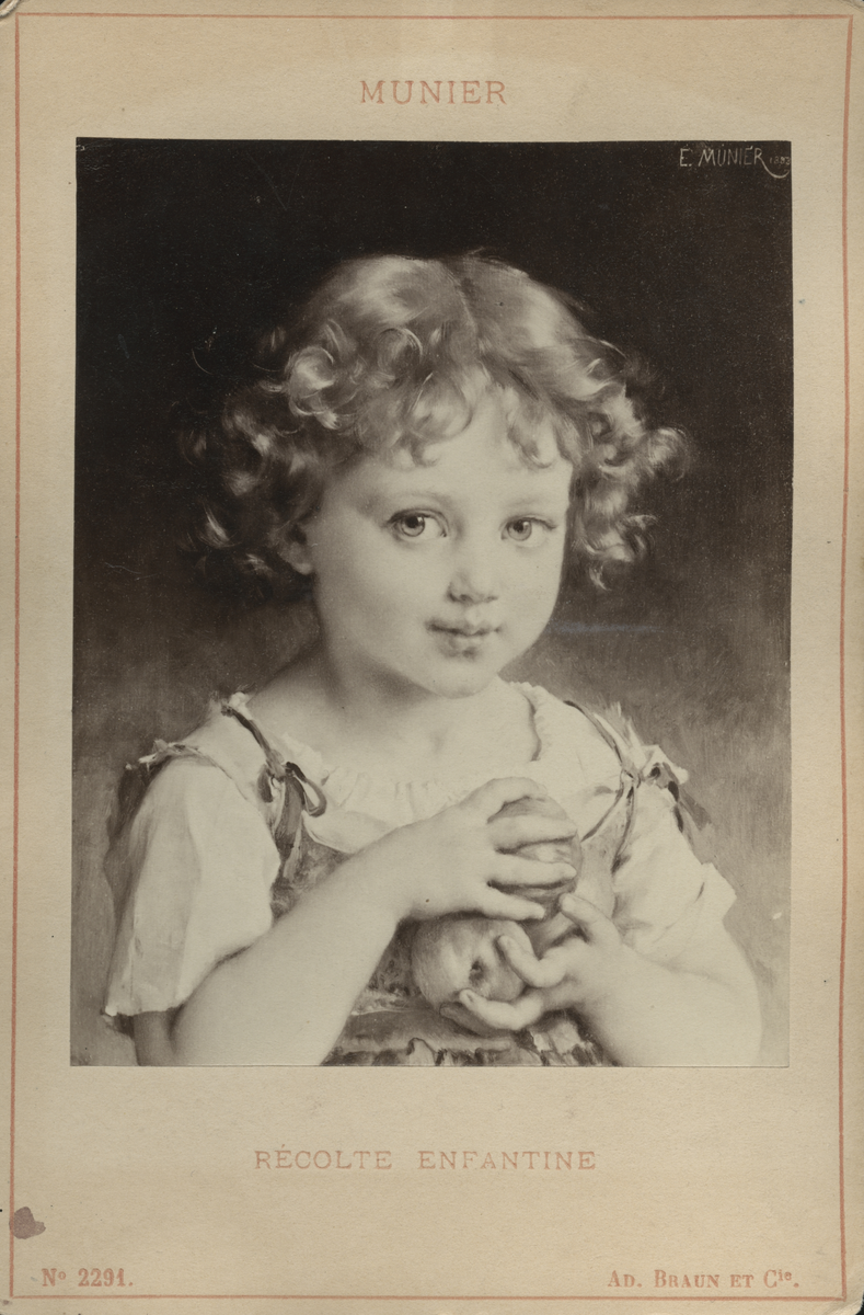 Porträtt av en liten flicka som håller i några äpplen. Text på framsida kort: MUNIER RÉCOLTE ENFANTINE.