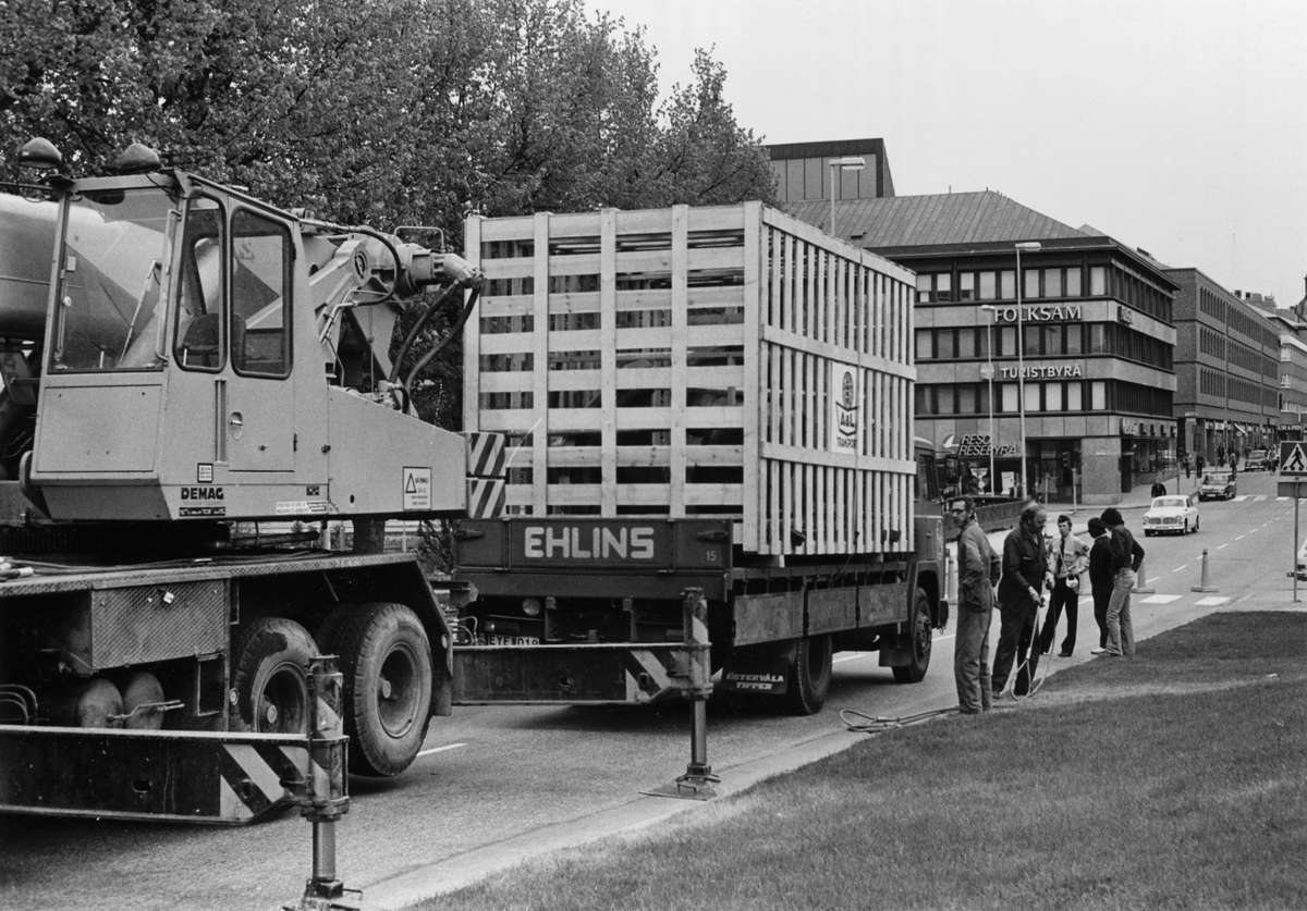 Titel: Moores skulptur "Tredelad vilande figur". Lossning och frakt genom staden till Slottstorget av skulpturen.