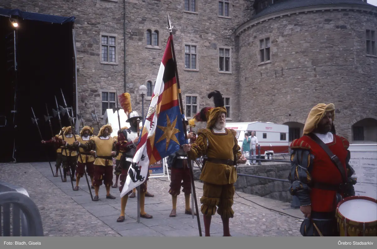 Soldater bakom fanbärare och trumslagare vid Örebro slott under slottsfestivalen, 1994
