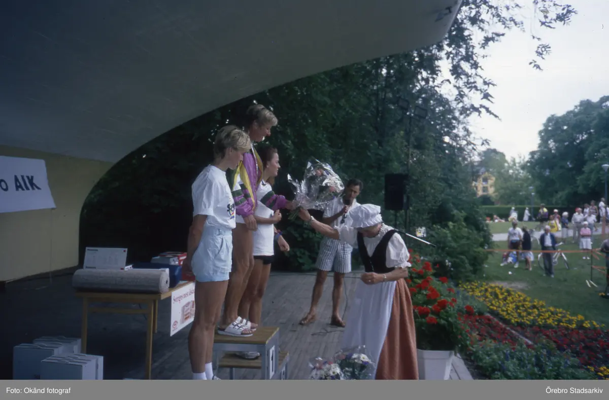 Gisela Bladh överlämnar blommor till vinnarna i Cajsa Warg-loppet på scenen i Stadsparken, 1992