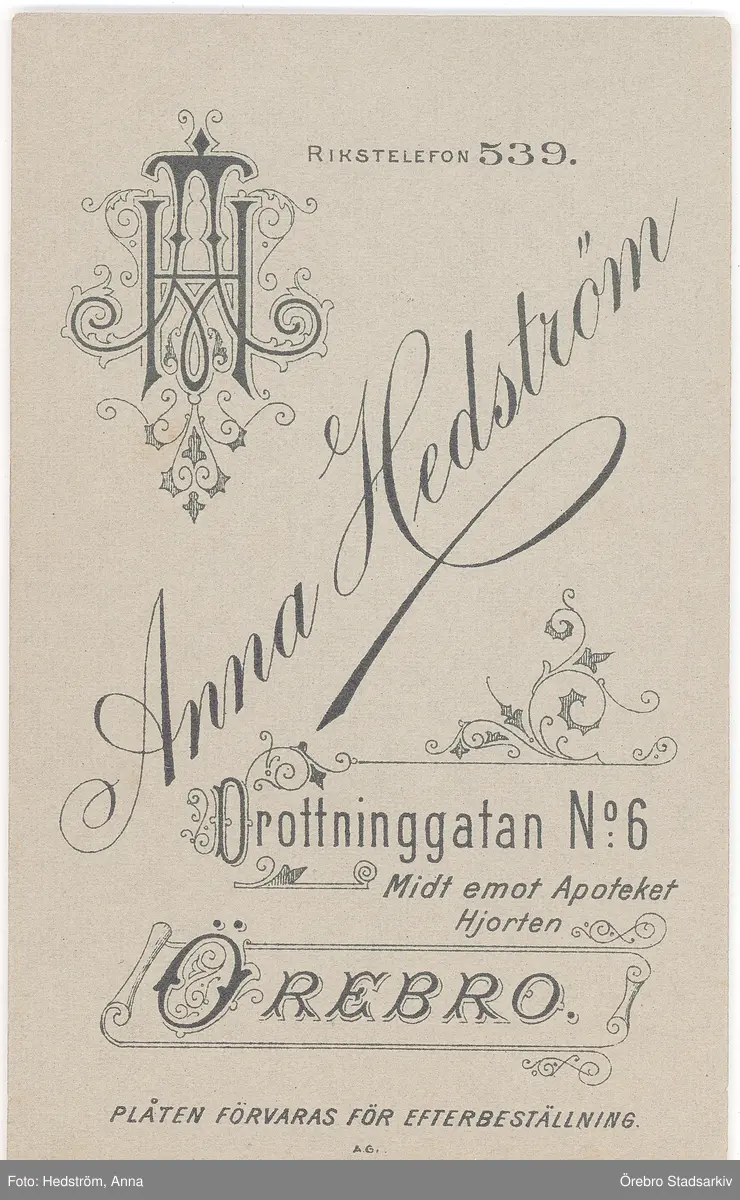Baksida till visitkort från Anna Hedström, 1890-1910