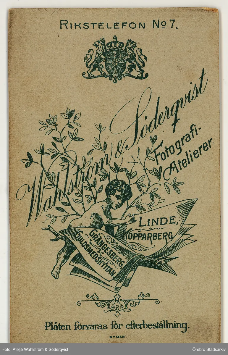 Baksida till visitkort från Wahlström & Söderqvist, Linde, Kopparberg, Grängesberg, Guldsmedshyttan, 1890-1904