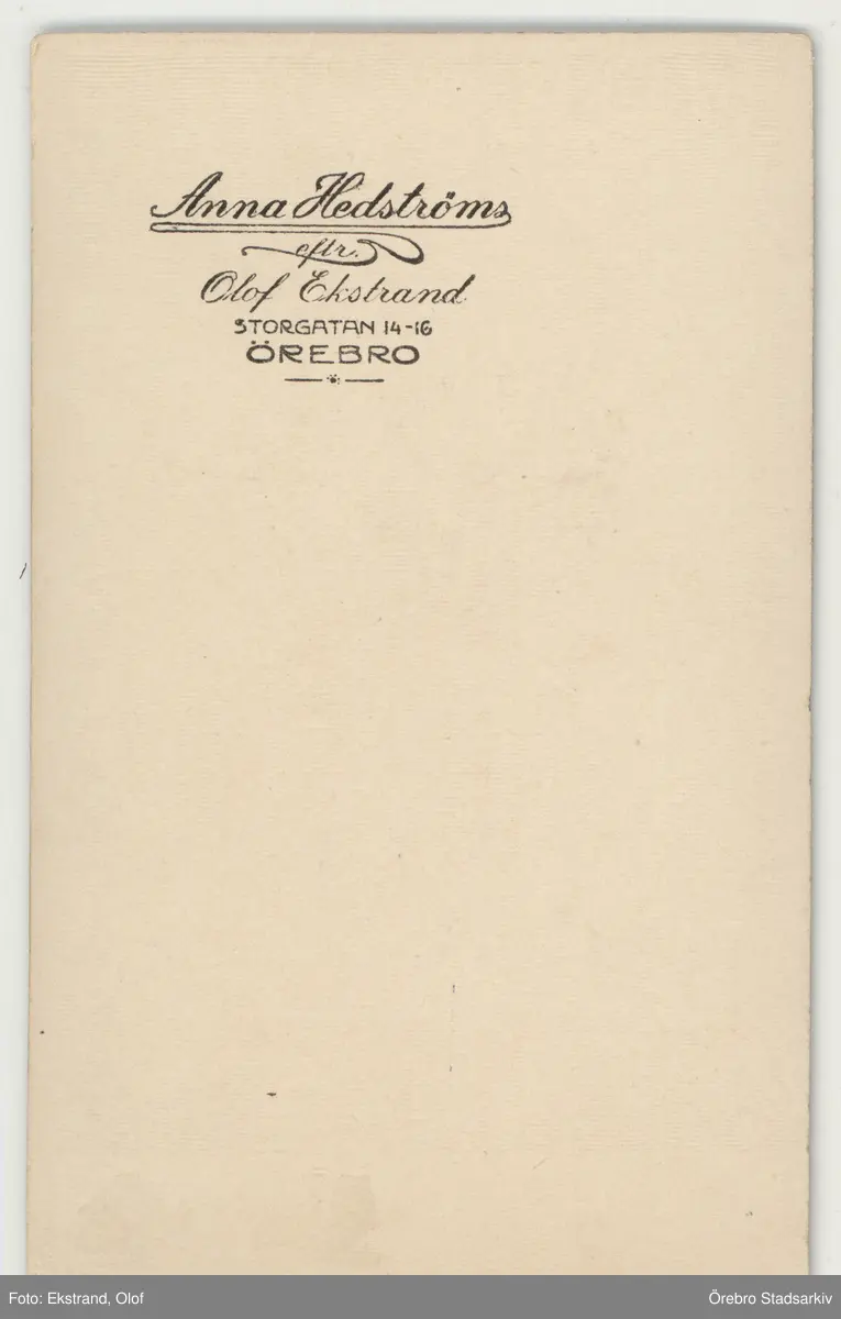 Baksida till visitkort från Anna Hedströms efterträdare Olof Ekstrand, efter 1910