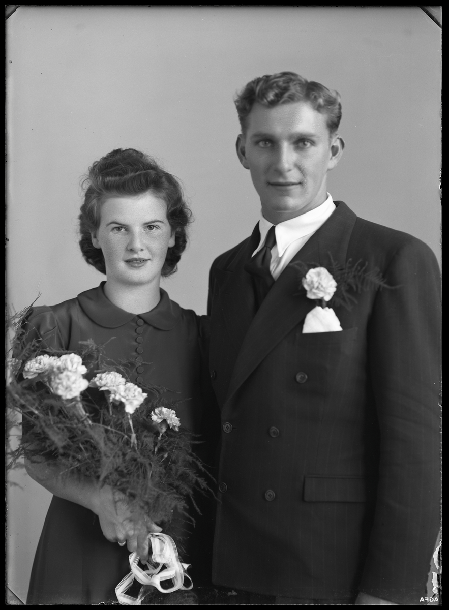 Bröllopsporträtt, brudpar. Rune Nornholm, Box 416 B, Hallstahammar.