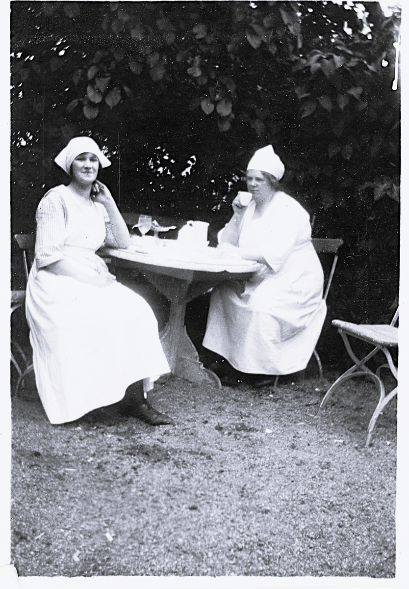 Foto av arbetskvinnor som tar en paus. Text baksida kort: "Fru Gustafsson å jag sommaren 1924 i Aug. Nya Badhotellet".