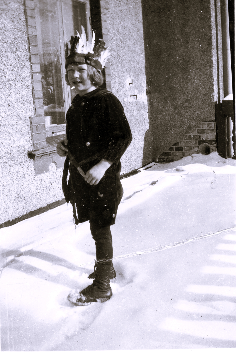 Foto av "farlig karl" (enligt text vid bild i albumet). Text baksida kort: "Det är ett rött band om hans midja som revolvern och kniven sitta i. En mycket farlig Injican som din som säger, han talar nämligen dålig svenska, stammar lite också, annars är han skarp".