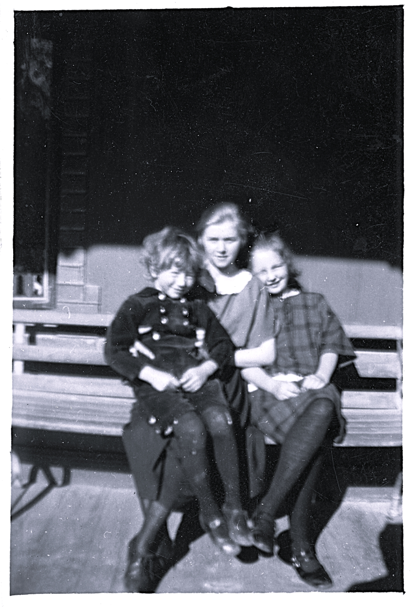 Foto av två barn i hembiträdes famn (enligt text vid bild i albumet). Text baksida kort: "Dina små och Britta, du minns hon är hos mig igen. Tre tyckte hon börja bli för gammal att vara barnflicka".