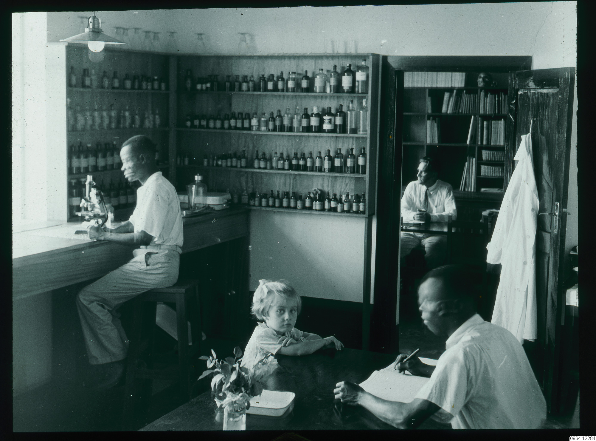 Ett rum med mediciner, "apotek". En man sitter vid mikroskop. I bakre rummet sitter läkaren. Ett barn undervisas av en annan man som sitter med papper och penna.