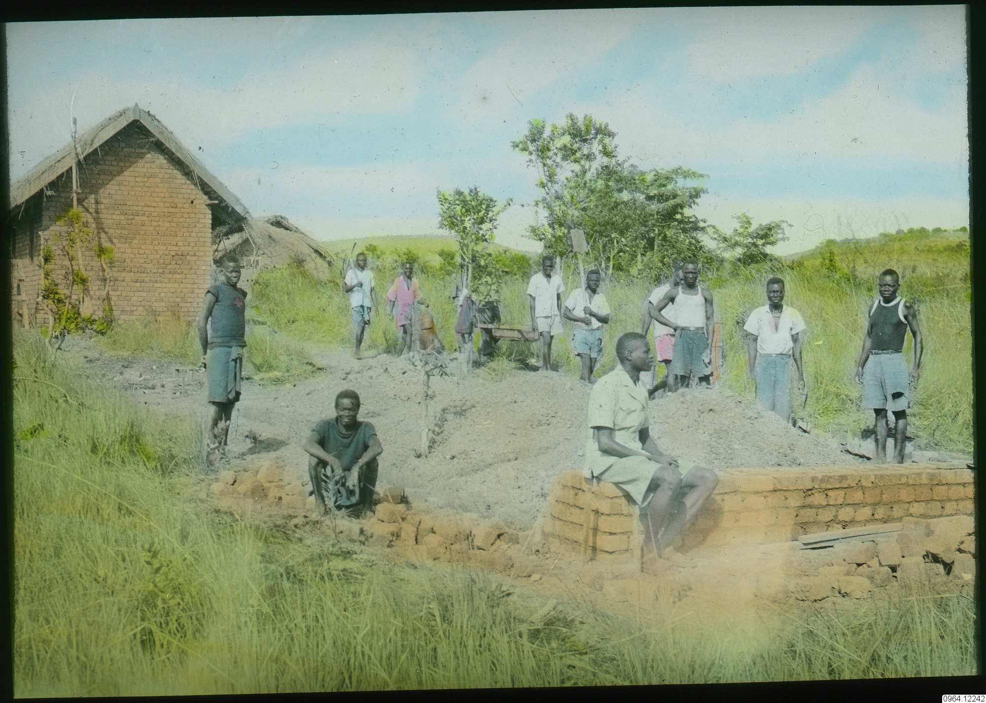 Bygg. en tegelvägg muras, i spetälskebyn.