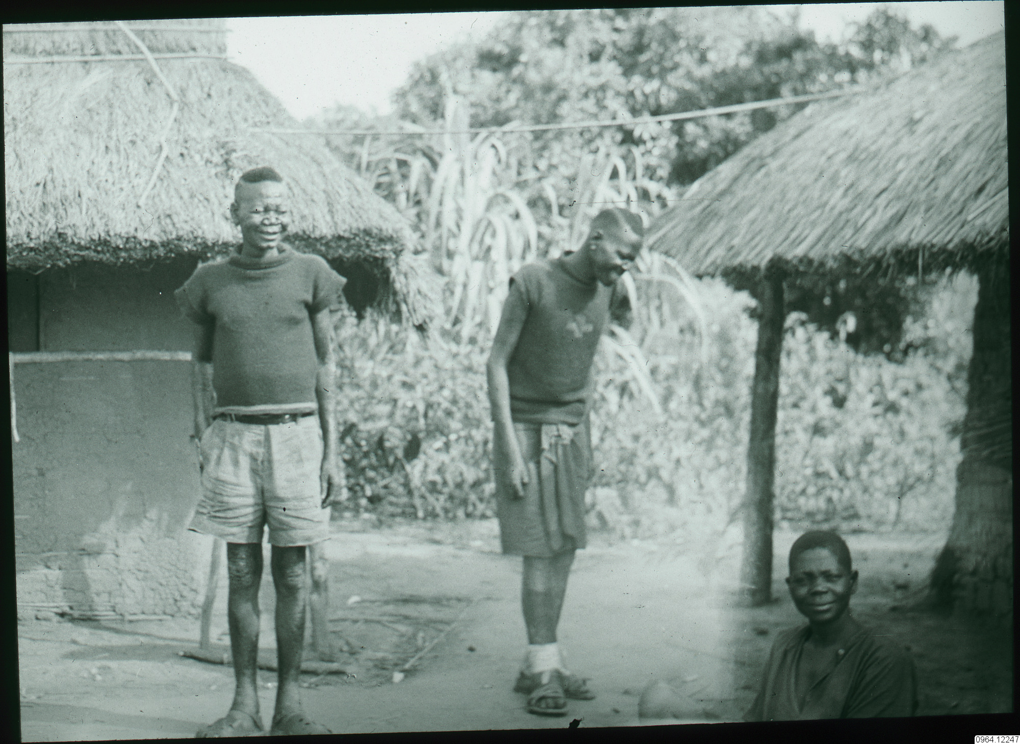 Tre män, två står, en sitter, framför hydda. De stående har kortbyxor.