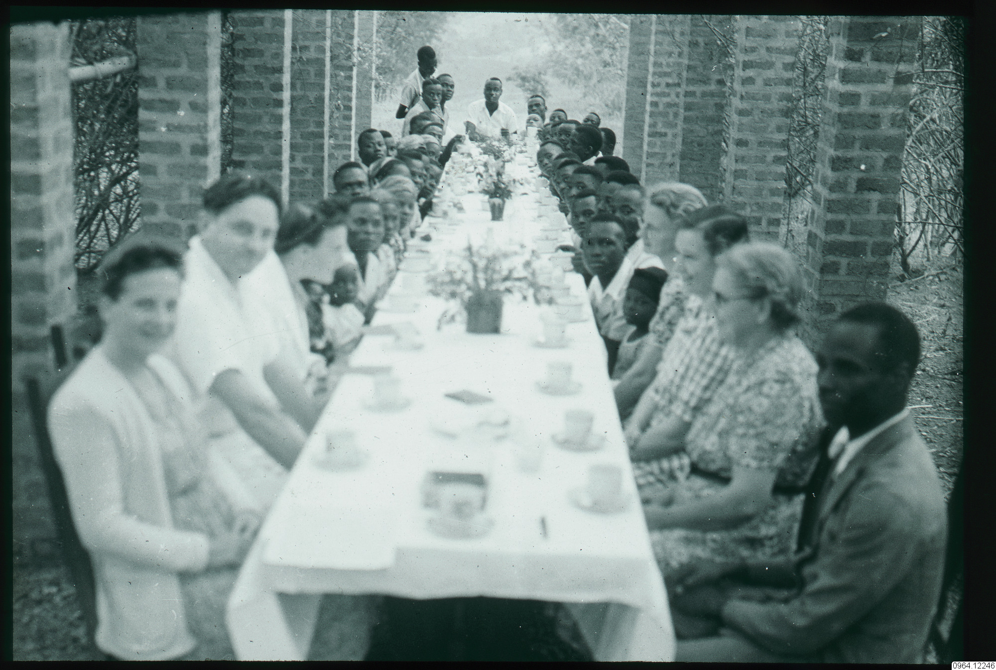 Dukat långbord med sittande missionärer och sannolikt församlingsmedlemmar. Kaffekoppar.