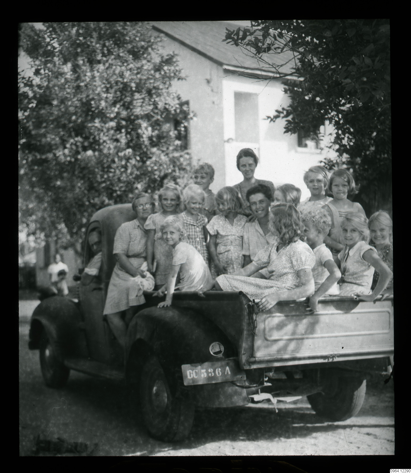 Lastbil. På flaket sitter en massa barn. På stänkskärm står BC536A (?). Möjligen samma lastbil som syns på 0964.8380 ("General Motors Truck").