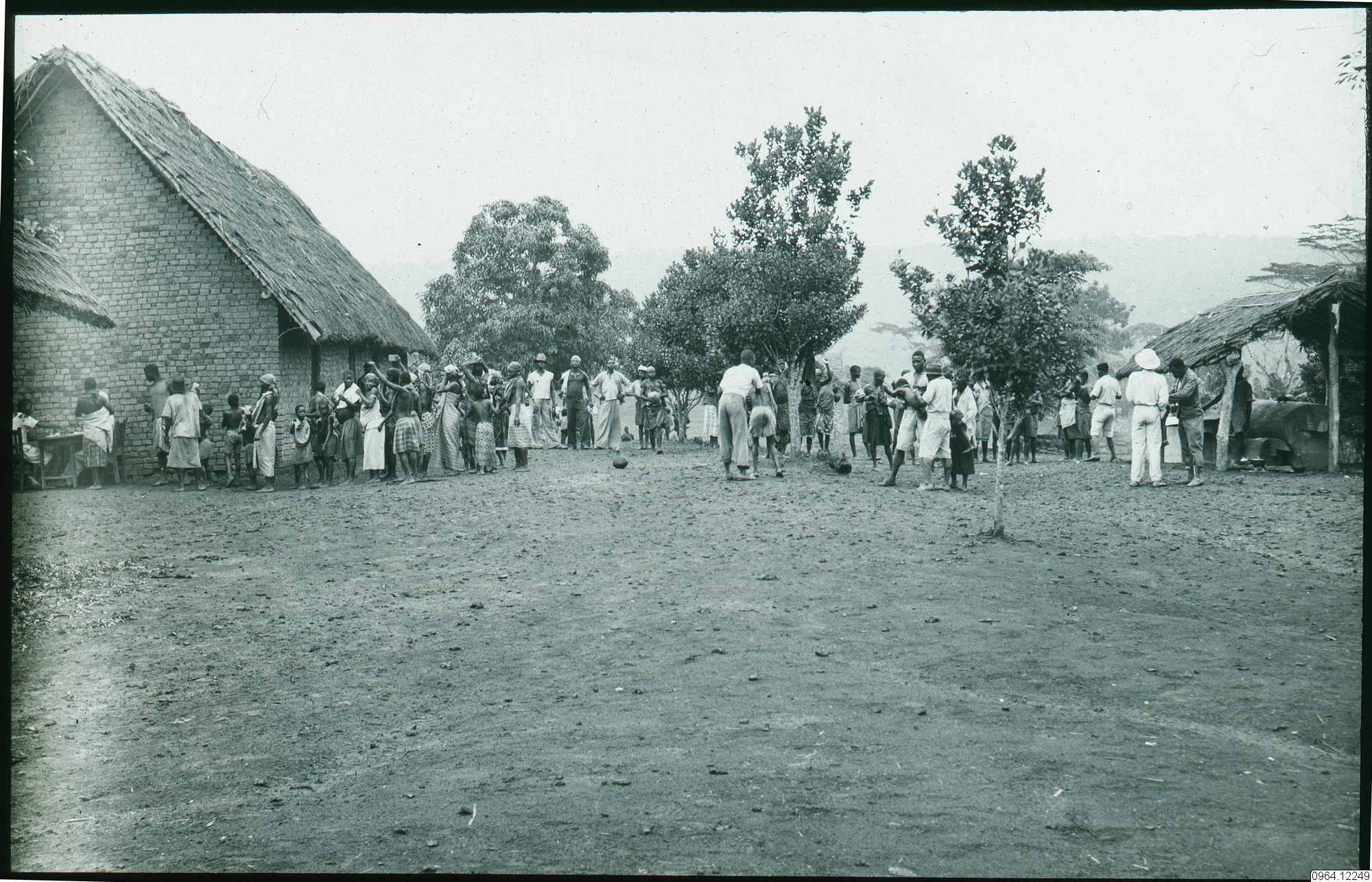 Missionärer i by. Ett tegelhus med gräs- halmtak.