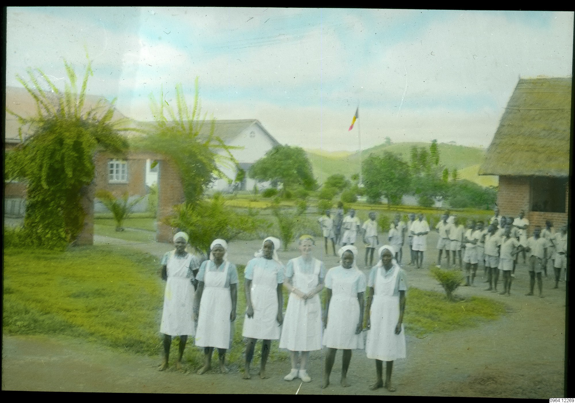 Sjuksköterkor vid Kibunzi. I bakgrunden drottning Astrids maternite de ruine. Kibunzi BB. En flaggstång med flagga.