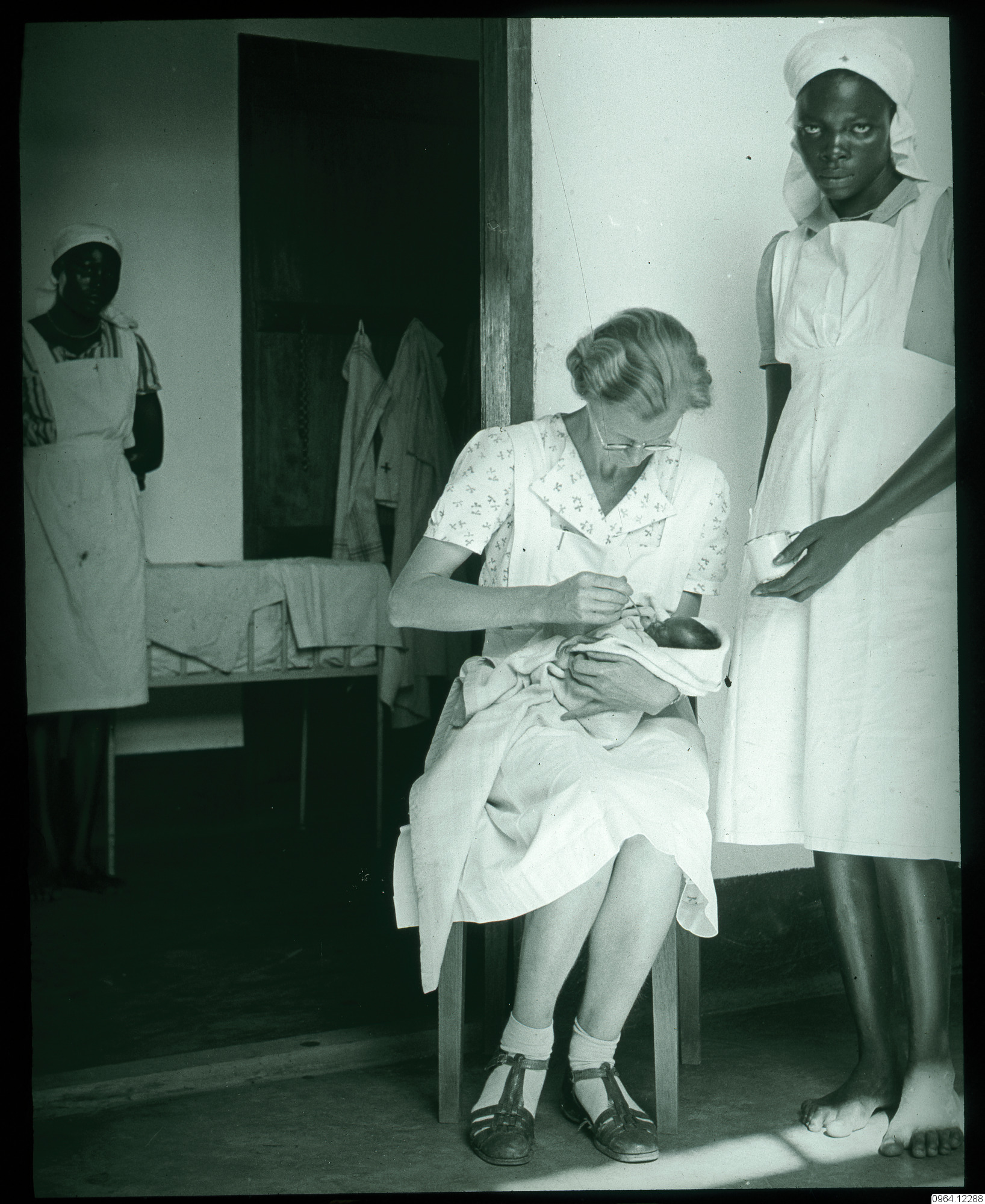 Sittande kvinna med barn, två stående kvinnor. Det skulle kunna vara Elin Carlsson.
