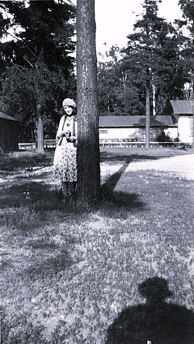 Titel: Foto av kvinna som lutar sig mot en trädstam och i förgrunden syns skuggan av fotografen. Text vid bild i album: "Kusiner".