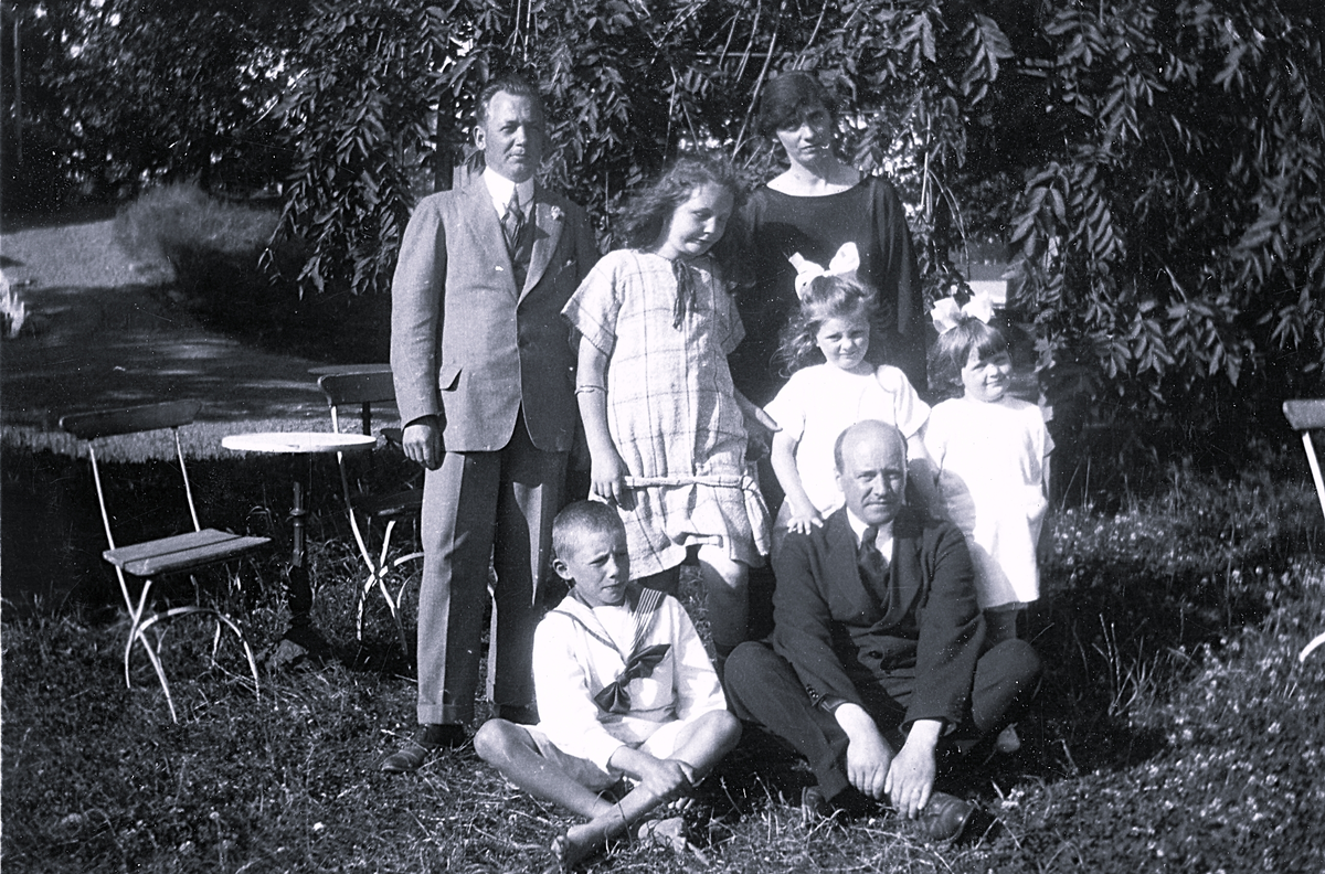 Foto av män, kvinnor och barn i en trädgård. Bildtext i album:" Familjen Bergvall m. döttrar, Inga-Lill å en främling".
