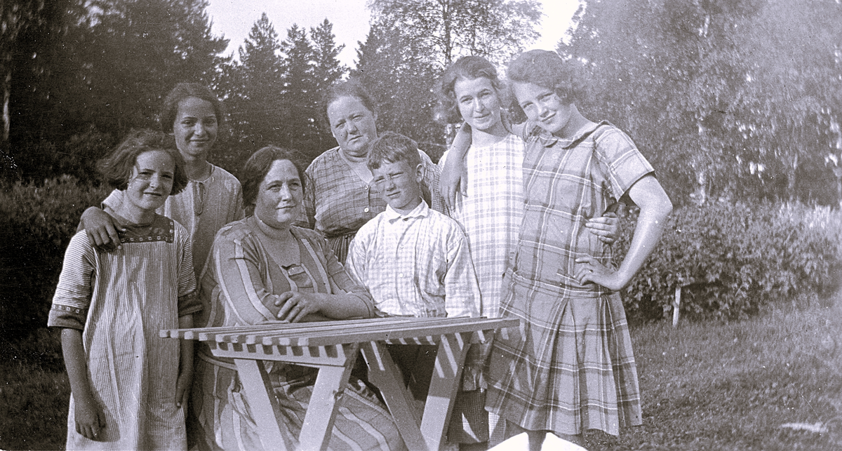 Foto av kvinnor och barn vid ett trädgårdsbord. Bildtext i album: "Hemma vid Taberg".